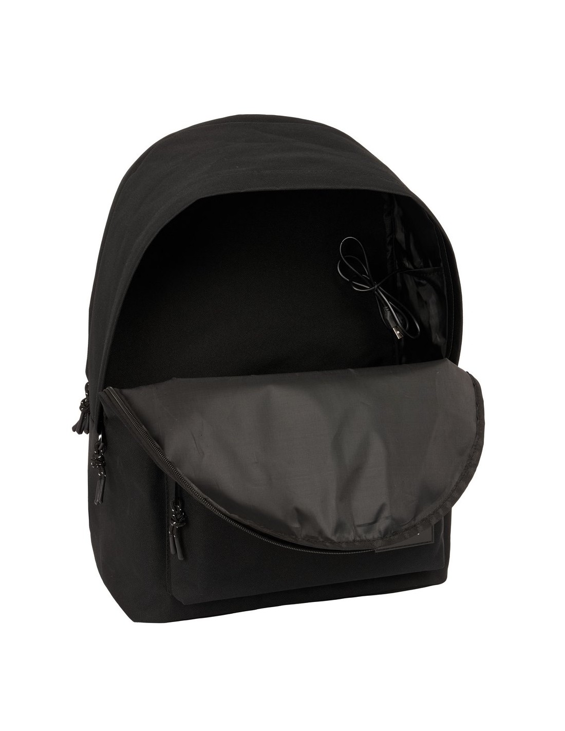 Alojamiento antirrobo trasero acolchado para portatil de hasta 15,6'' y tablet de hasta 11''. Compartimento principal de gran capacidad con cremallera. Conector USB para cargar movil u otros dispositivos electrónicos. Base acolchada. Bolsillo frontal con cremallera. Doble tirador en cremallera principal para facilitar su apertura. Hombreras y espalda ergonómicas y acolchadas. Asa de mano en la parte superior.