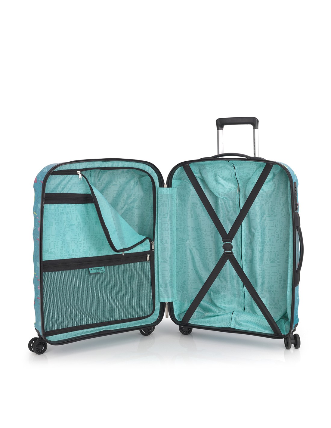 Colección Acqua de Gabol, con un bonito estampado de elementos simbólicos del mar sobre un fondo turquesa. Maleta mediana con 4 ruedas dobles, con capacidad total de 37,6L. El material de fabricación es ABS y policarbonato y su interior está compuesto por un forro de alta calidad con bolsillos. Incluye cerradura TSA. Medidas Maleta Mediana: 47x66x25 cm
