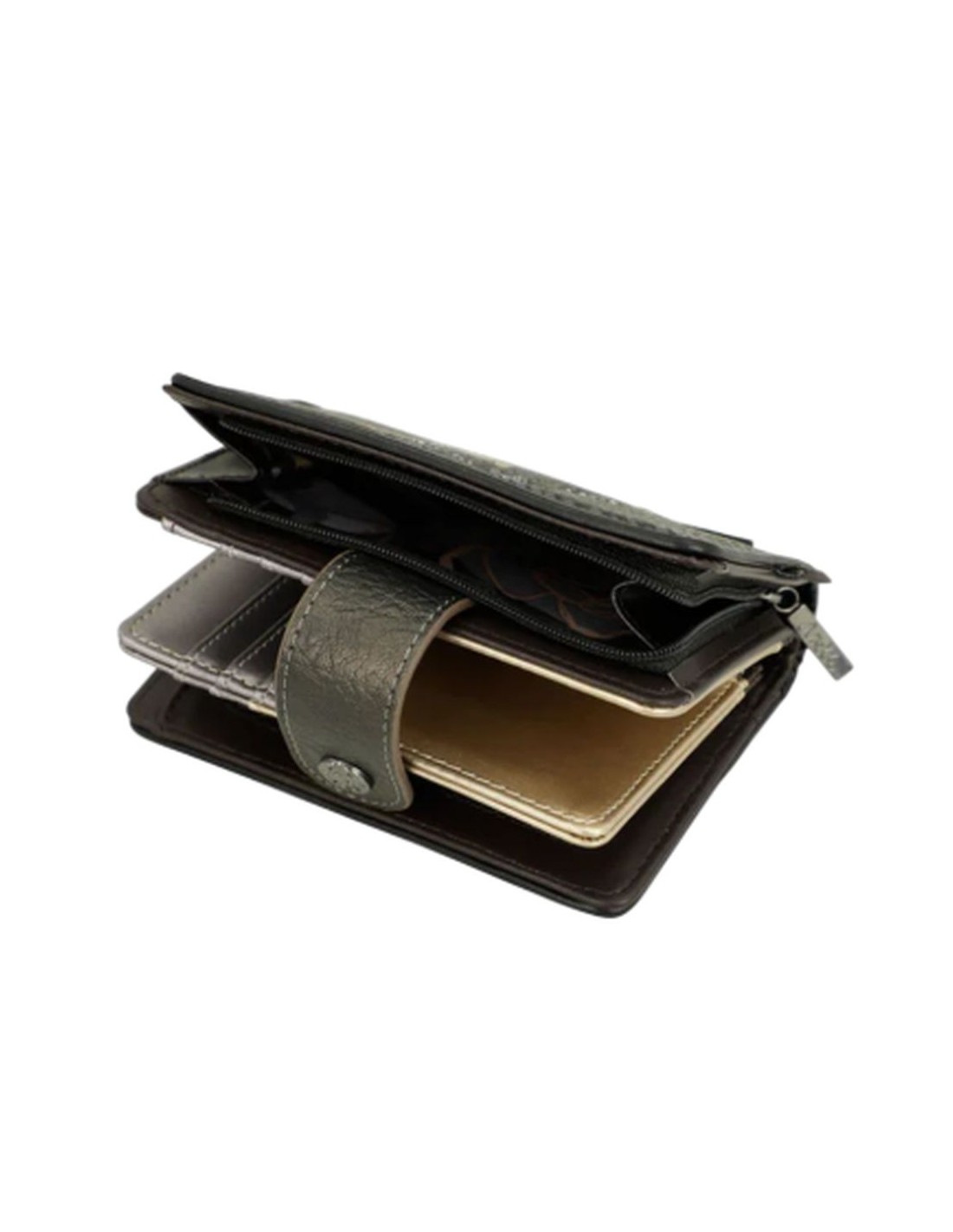 Compartimento para monedas con cierre de cremallera,amplio tarjetero y espacio para billetes que cierran con botón de clip.