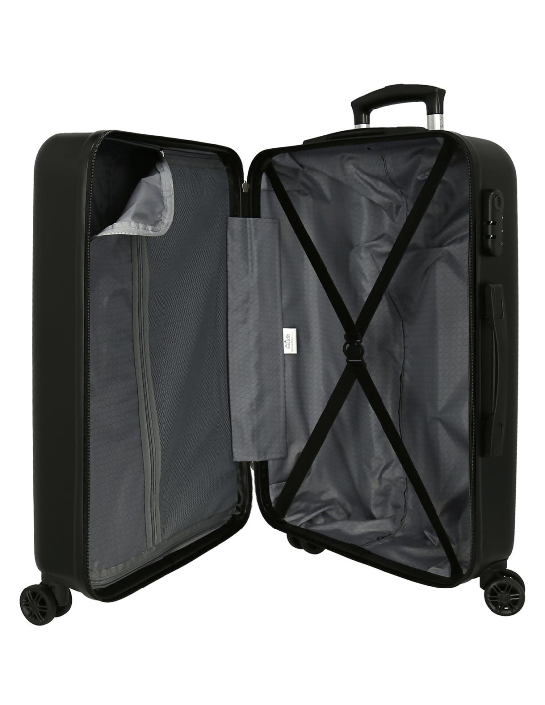 Maleta Mediana de 46 cm x 65 cm x 23 cm (ruedas y asa incluida). Tiene una capacidad de 56L y pesa 3,1 kg. Fabricada en ABS, un material resistente y ligero. Incluye un compartimento interior con bolsillo de cremallera en uno de los lados y gomas elásticas de sujeción en el otro para mantener todo el material organizado. Cuatro ruedas dobles de giro multidireccional para un desplazamiento cómodo, un rodaje suave y una maniobrabilidad sin esfuerzo. Cierre de combinación lateral para aumentar la seguridad del equipaje. Protege todo el contenido con su sistema de cierre seguro. De Joumma bags