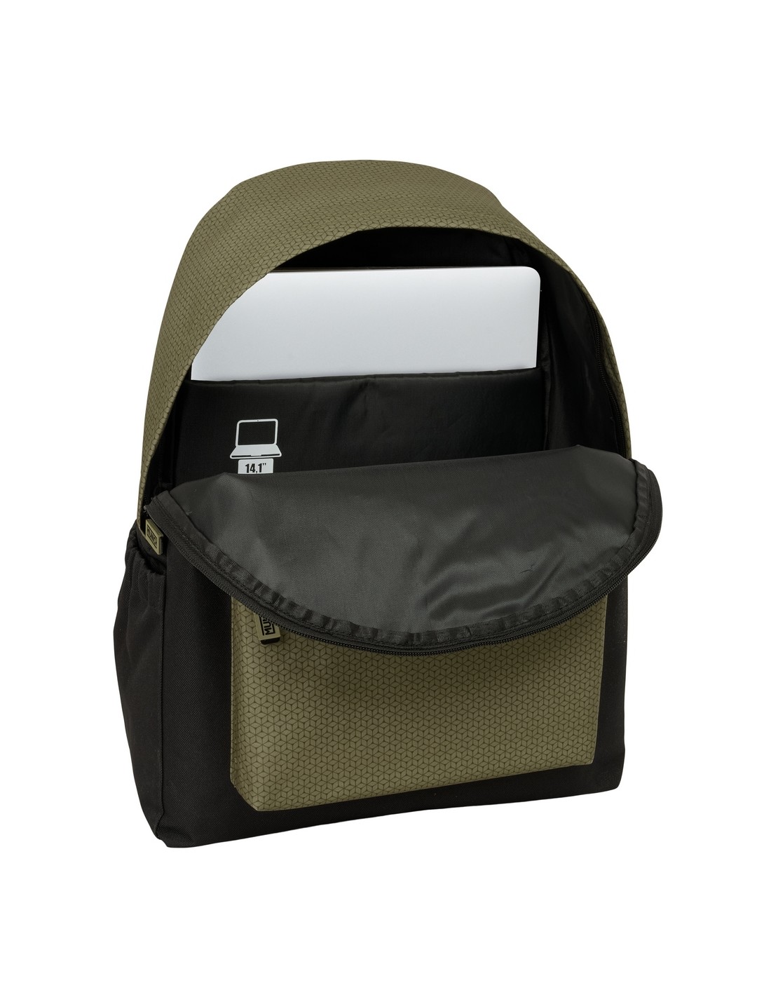 Alojamiento acolchado para portatil de hasta 14,1''. Bolsillo frontal con cremallera. Bolsillo lateral portabotellas. Doble tirador en cremallera principal para facilitar su apertura. Hombreras y espalda ergonómicas y acolchadas. Interior de la hombrera en polipiel. Asa de mano en la parte superior.