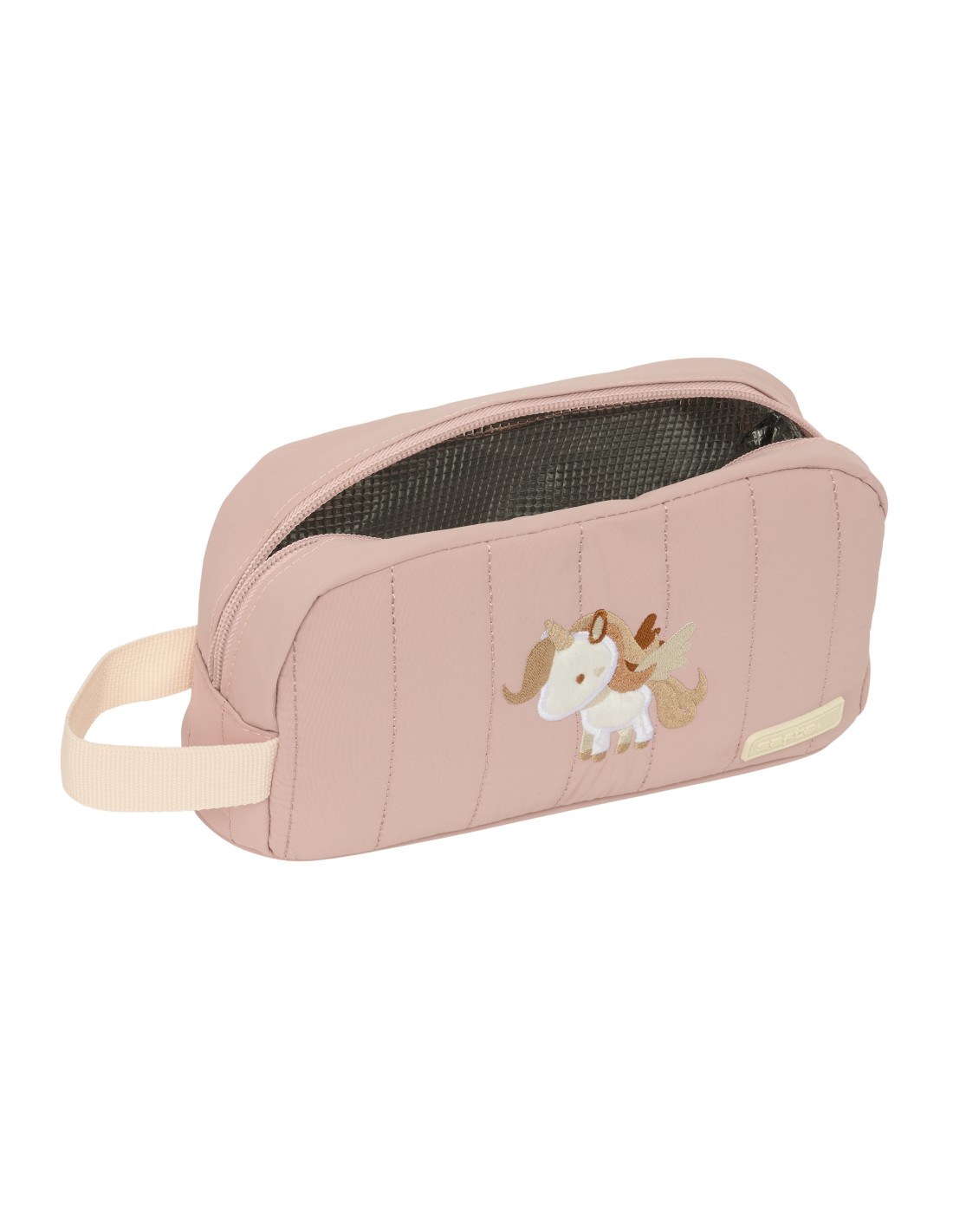 Interior forrado de alumínio para mantener frio-calor. Asa de mano en la parte lateral. Compartimento con cremallera.