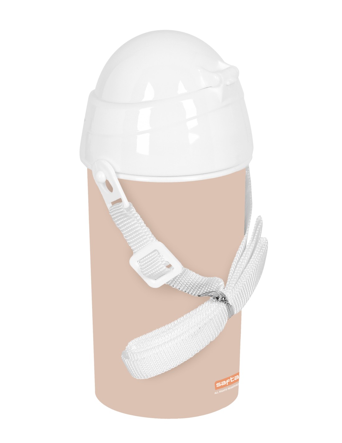 Botella de PVC. Tapa con apertura automática mediante botón. Con pajita interior. Cinta bandolera para colgar. 500ml de capacidad. Sin BPA.